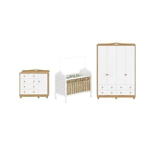 Um ambiente encantador e delicado, transmitindo tranquilidade e conforto para todos. Produtos fabricados com linhas suaves com estrutura em 100% MDF e acabamento em Pintura UV atóxica é o destaque deste ambiente. As gavetas possuem corrediças telescópicas para facilitar o deslize das gavetas e os espaços internos proporcionam armazenamento prático para roupas e itens essenciais em suas prateleiras e nos cabideiros em alumínio. Medidas dos produtos: Guarda Roupa: 231,10 x 156,80 x 49,30 (AxLxP) Cômoda: 113 x 120,30 x 50,30 (AxLxP)! Acompanha Colchão: Não Altura do Conjunto: 231,1 cm Ambiente Principal: Quarto de Bebê codigo_ean: 7900288015587 Cor: Branco Brilho/Amêndoa/Branco Cor do Produto: Branco Brilho/Amêndoa/Branco Estrado com Regulagem de Altura: Sim Informação Complementar: 1x Kit Capitonê Berço 2 Peças Elô Sintético Branco Largura: 62,8 cm Altura: 78,3 cm Peso: 6,28 kg Profundidade: 4 cm Necessita Montagem: Sim