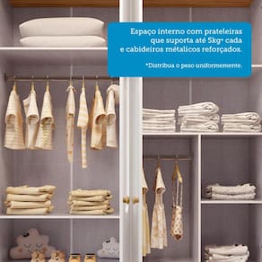 As gavetas possuem corredi?as telesc?picas para facilitar o deslize das gavetas e os espa?os internos proporcionam armazenamento pr?tico para roupas e itens essenciais em suas prateleiras e nos cabideiros em alum?nio.