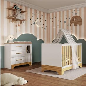 Com design retrô, inspirado nas décadas passadas, combinamos a elegância clássica com praticidade moderna, proporcionando um espaço encantador para o seu pequeno crescer e sonhar! São produtos desenvolvidos em 100% MDF, acabamento em pintura UV atóxica e bordas arredondadas, oferecendo mais segurança para toda família. As gavetas possuem corrediças telescópicas que garantem o deslize suave e silencioso. O berço é certificado peço INMETRO e permite o uso como minicama ou minisofá. Transforme o quarto do seu bebê com produtos elegantes, atemporais, com a qualidade e o design que você procura! Ambiente comporto por: - 1 Cômoda 1 Porta com Janela 89,40 x 92,90 x 42 (A x L x P - cm) - 1 Berço Mini Cama 88,20 x 132,4 x 75,60 (A x L x P - cm)