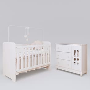 Nossas peças são em 100% MDF de alta resistência mecânica e ainda formam um par perfeito. O berço multifuncional é o melhor custo benefício, já que serve também como mini-cama e mini-sofá. A cômoda fraldário tem travas anti-tombamento que garantem mais segurança para o seu bebê. Estes produtos se encontram disponíveis nas cores Branco e Branco com Bétula.