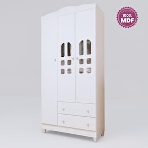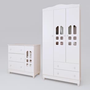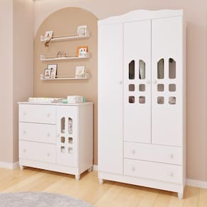 O dormitório perfeito para combinar com a decoração que você escolheu para acolher o seu baby. O guarda-roupa em que você tem ainda mais espaço para acomodar os pertences do seu bebê, de forma que as roupas não fiquem amassadas ou apertadas. Com cabideiro, prateleira e gavetas, as mamães podem organizar tudo de forma prática e funcional. Peça fabricada em 100% MDF de alta resistência mecânica, a cômoda é uma peça chave na organização de objetos, roupas e acessórios do bebê. O móvel tem um sistema de trava anti-tombamento e corrediça telescópicas nas gavetas. Este produto se encontra disponível nas cores Branco e Branco com Bétula.