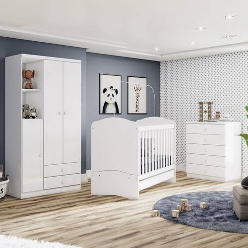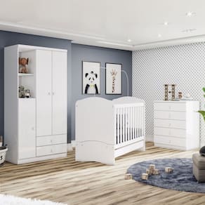 O(a) Quarto de Bebê Completo Bala de Menta 3 Portas 7 Gavetas Branco - Henn é produzido em MDF na escala de brilho Fosco, e possui um grau de dificuldade de montagem: Médio.