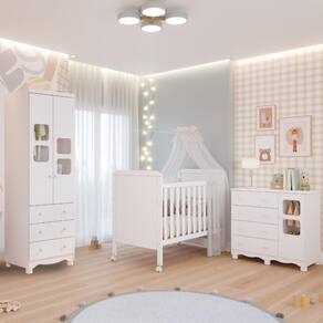 O Guarda Roupa e a Cômoda são espaçosos e seguros, perfeitos para armazenar os itens do bebê, enquanto o Berço Cloe, que se transforma em Mini Cama, combina funcionalidade com um design contemporâneo.