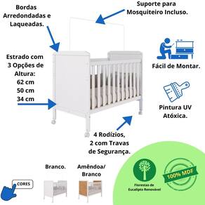 Produzido em 100% MDF, o Berço Cloe possui pintura atóxica, garantindo segurança. A base do colchão é ajustável em três alturas, acompanhando o crescimento do seu filho. Além disso, conta com rodízios, sendo dois com trava de segurança, e grades robustas para maior proteção. As bordas arredondadas proporcionam um toque suave.