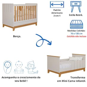 Para criar um quarto do bebê que une sofisticação e segurança, o conjunto Berço e Cômoda Estilo Retrô é a escolha ideal. O Berço Estilo Retrô, feito em 100% MDF com acabamento em pintura laca e detalhes em baixo relevo, não só oferece um ambiente acolhedor desde os primeiros dias, mas também se transforma em uma charmosa mini cama à medida que seu filho cresce. Com estrado ajustável em duas alturas e duas grades fixas, este berço combina elegância e funcionalidade, adaptando-se às necessidades do seu pequeno ao longo do tempo.