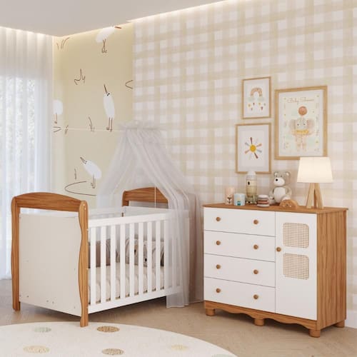 O quarto de bebê composto pelo Berço Marquesa e a Cômoda Uli Telinha é uma escolha perfeita para quem busca segurança e funcionalidade. O Berço Marquesa, feito 100% em MDF, possui pintura atóxica e varal para mosquiteiro. Além disso, sua base tem três opções de altura para acompanhar o crescimento do bebê, e sua versatilidade permite que seja transformado em mini cama ou mini sofá. Todos os berços da Móveis Peroba são certificados pelo INMETRO, assegurando qualidade e segurança.