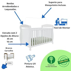 O Berço Marquesa, padrão americano, é um produto feito com muito cuidado para compor o quarto do seu bebê. Produzido com material 100% MDF.