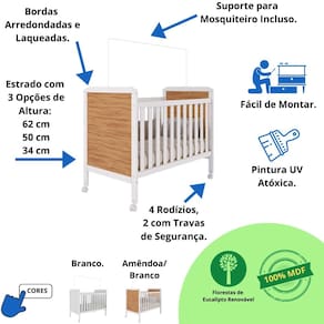 Possui a base do colchão com 03 opções de altura, acompanhando o crescimento do seu bebê. Conta ainda com 4 rodízios sendo 2 com trava de segurança. As grades são fabricadas em 25 e 12 mm, os quadros das cabeceiras também em chapa de 25 mm. Possui Bordas arredondadas e laqueadas, proporcionando maior segurança e uma sensação agradável ao toque.
