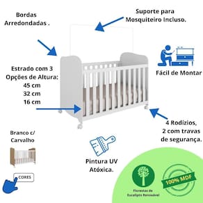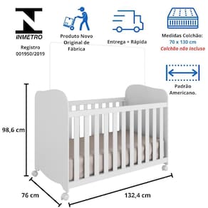 Dimensões do berço montado: Altura 98 cm x Largura 132 cm x Profundidade: 76 cm