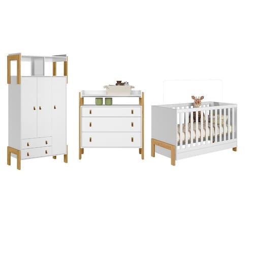 Características: Estrutura em MDP Acabamento em pintura UV Acetinada Berço com Grades Fixas em MDF Estrado em MDF com 3 opções de altura Acompanha suporte para mosquiteiro Pode ser montado no modelo Mini Cama Berço Suporta até 40 kg. Guarda Roupa com Cabideiro oblongo metálico Gavetas com corrediças telescópicas Puxadores inspirados no cou-ro Portas com dobradiças metálicas Pés em MDF de 25mm Sistema anti-tombamento para evitar riscos de acidentes. ATENÇÃO: Não Acompanha Colchão.