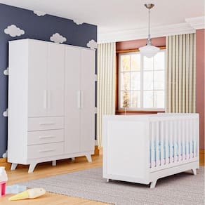 Inspirado no estilo retro do passado com um toque de modernidade da linha Retro. O berço é certificado pelo INMETRO no registro 000781/2018, tem a opção de ser utilizado como mini cama, acompanha um suporte para mosquiteiro e a base do colchão é regulável em 3 opções de altura, aumentando o conforto no uso diário e na segurança com o crescimento do seu pequeno(a). Todos os móveis são com acabamento em pintura UV atóxica e com a qualidade de ser produzido em 100% MDF. As gavetas possuem corrediças telescópicas e suportam até 4kg cada. O guarda roupas possui 2 cabideiros metálicos e 4 prateleiras. Tudo para oferecer um quartinho aconchegante, pratico e lindo para o seu bebê. Acompanha Colchão: Não Altura do Conjunto: 209,6 cm Ambiente Principal: Quarto de Bebê codigo_ean: 7909903060629 Complexidade da Montagem: Alta: deve ser montado por um montador especializado Cor: Branco Brilho Cor do Produto: Branco Brilho Escala de Brilho: Brilhante Estrado com Regulagem de Altura: Sim Informação Complementar: 1x Berço Mini Cama Retrô Branco Brilho Largura: 135,5 cm Altura: 92,2 cm Peso: 39,28 kg Profundidade: 76,3 cm Necessita Montagem: Sim