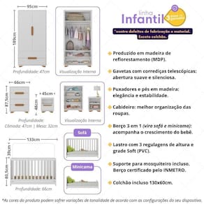 - Berço 3 em 1 versátil: transforma-se em sofá e minicama, acompanhando o crescimento da criança.