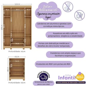 Diferenciais: - 3 anos de garantia contra defeitos de fabricação e material (exceto colchão). - Conjunto produzido em madeira de reflorestamento (MDP/MDF 12/15mm) com acabamento acetinado (cerca de 20% de brilho): sustentabilidade e durabilidade. - Berço 3 em 1 que se transforma em sofá e minicama, acompanhando o crescimento do bebê. - Lastro em madeira com 3 regulagens de altura e suporte para mosquiteiro para noites mais tranquilas e protegidas. - Berço certificado pelo INMETRO (Selo n 000332/2025). - Colchão D18 incluso: possui tratamento antiácaro, antialérgico, antimofo e um dos lados impermeável. - Frentes (guarda-roupa e cômoda) produzidas em MDF. - Guarda-roupa com 4 portas e 2 gavetas: amplo espaço para organizar roupinhas e acessórios. - Cômoda com 4 gavetas. - Detalhes de vidro incolor temperado 3mm nas portas: toque charmoso que permite visualizar o interior dos móveis. - Corrediças telescópicas: abertura total e silenciosa das gavetas. - Cabideiro em alumínio: permite acomodar roupas longas e curtas para que não amassem. - Puxadores em ABS delicados e práticos. - Pés em polipropileno e rodapés: visual elegante e estabilidade para o guarda-roupa e a cômoda. - Sistema antitombamento no guarda-roupa e cômoda: proporciona segurança para o bebê e tranquilidade aos pais.