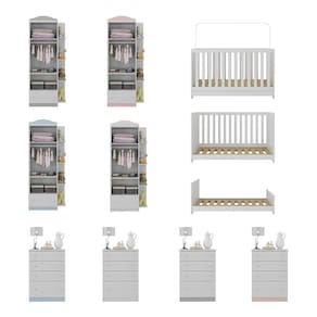 O Quarto de Bebê Completo com Berço 3 em 1 com Colchão Multimóveis MP4163 é a escolha perfeita para um ambiente estiloso e confortável para o bebê. Produzido em MDP com acabamento acetinado (cerca de 20% de brilho), garante durabilidade e resistência. O berço se transforma em sofá e minicama, acompanhando o crescimento do seu filho, possui 3 regulagens de altura para o colchão e acompanha suporte para mosquiteiro, garantindo noites mais tranquilas de sono para o bebê. A grade Soft (PVC) é produzida de maneira ecologicamente correta, com matéria-prima livre de metais pesados, atóxica e com proteção anti-amarelamento. Berço certificado pelo INMETRO sob o selo n 0000085/2018. O colchão possui estrutura em espuma e tecido poliéster. De conforto macio, possui tratamento anti-ácaro e anti-alérgico e é indicado para até 50kg. Com amplo espaço interno, o guarda-roupas possui 2 portas e uma gaveta, além de 4 prateleiras externas. A cômoda conta com 4 gavetas espaçosas e sistema anti-tombamento. A cômoda e o guarda-roupas possuem puxadores em ABS, corrediças metálicas (que oferecem leveza no manuseio) e ainda acompanham detalhes em 4 cores (Branco, Rosa, Azul e Cinza), permitindo que você escolha qual combina mais com sua decoração na hora da montagem.