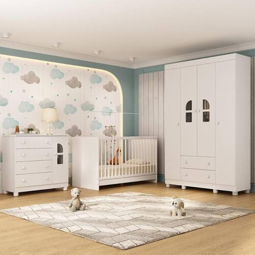 Diferenciais: - 3 anos de garantia contra defeitos de fabricação e material. - Conjunto produzido em madeira de reflorestamento (MDP/MDF 12/15mm) com acabamento acetinado (cerca de 20% de brilho): sustentabilidade e durabilidade. - Berço 3 em 1 que se transforma em sofá e minicama, acompanhando o crescimento do bebê. - Lastro em madeira com 3 regulagens de altura e suporte para mosquiteiro para noites mais tranquilas e protegidas. - Berço certificado pelo INMETRO (Selo n 000332/2025). - Padrão nacional (tamanho do colchão indicado: 130x60cm). Colchão não incluso. - Frentes (guarda-roupa e cômoda) produzidas em MDF. - Guarda-roupa com 4 portas e 2 gavetas: amplo espaço para organizar roupinhas e acessórios. - Cômoda com 1 porta e 4 gavetas. - Detalhes de vidro incolor temperado 3mm nas portas: toque charmoso que permite visualizar o interior dos móveis. - Corrediças telescópicas: abertura total e silenciosa das gavetas. - Cabideiro em alumínio: permite acomodar roupas longas e curtas para que não amassem. - Puxadores em ABS delicados e práticos. - Pés em polipropileno e rodapés: visual elegante e estabilidade para o guarda-roupa e a cômoda. - Sistema antitombamento no guarda-roupa e cômoda: proporciona segurança para o bebê e tranquilidade aos pais.