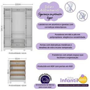 Diferenciais: - 3 anos de garantia contra defeitos de fabricação e material. - Conjunto produzido em madeira de reflorestamento (MDP/MDF 12/15mm) com acabamento acetinado (cerca de 20% de brilho): sustentabilidade e durabilidade. - Berço 3 em 1 que se transforma em sofá e minicama, acompanhando o crescimento do bebê. - Lastro em madeira com 3 regulagens de altura e suporte para mosquiteiro para noites mais tranquilas e protegidas. - Berço certificado pelo INMETRO (Selo n 000332/2025). - Padrão nacional (tamanho do colchão indicado: 130x60cm). Colchão não incluso. - Frentes (guarda-roupa e cômoda) produzidas em MDF. - Guarda-roupa com 4 portas e 2 gavetas: amplo espaço para organizar roupinhas e acessórios. - Cômoda com 4 gavetas. - Detalhes de vidro incolor temperado 3mm nas portas: toque charmoso que permite visualizar o interior dos móveis. - Corrediças telescópicas: abertura total e silenciosa das gavetas. - Cabideiro em alumínio: permite acomodar roupas longas e curtas para que não amassem. - Puxadores em ABS delicados e práticos. - Pés em polipropileno e rodapés: visual elegante e estabilidade para o guarda-roupa e a cômoda. - Sistema antitombamento no guarda-roupa e cômoda: proporciona segurança para o bebê e tranquilidade aos pais.