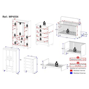Dimensões do Produto Montado: Berço - Altura: 80,5cm | Largura: 133cm | Profundidade: 66cm Guarda-roupa - Altura: 189cm | Largura: 122cm | Profundidade: 41cm Cômoda - Altura: 88cm | Largura: 65cm | Profundidade: 42cm *Você pode consultar as medidas detalhadas na imagem técnica do produto.
