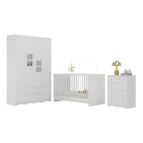 Diferenciais: - Conjunto produzido em MDP/MDF (12/15mm) de reflorestamento com acabamento acetinado (cerca de 20% de brilho): sustentabilidade e durabilidade. - Berço 3 em 1 que se transforma em sofá e minicama, acompanhando o crescimento do bebê. - Lastro em madeira com 3 regulagens de altura e suporte para mosquiteiro para noites mais tranquilas e protegidas. - Berço certificado pelo INMETRO (Selo n 000332/2025). - Padrão nacional (tamanho do colchão indicado: 130x60cm). Colchão não incluso. - Frentes e rodapés (guarda-roupa e cômoda) produzidos em MDF. - Guarda-roupa com 4 portas e 2 gavetas: amplo espaço para organizar roupinhas e acessórios. - Cômoda com 4 gavetas. - Detalhes de vidro incolor temperado 3mm nas portas: toque charmoso que permite visualizar o interior dos móveis. - Corrediças telescópicas: abertura total e silenciosa das gavetas. - Cabideiro em alumínio: permite acomodar roupas longas e curtas para que não amassem. - Puxadores em ABS delicados e práticos. - Rodapés usinados: visual elegante para o guarda-roupa e a cômoda. - Sistema antitombamento no guarda-roupa e cômoda: proporciona segurança para o bebê e tranquilidade aos pais.