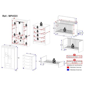 Dimensões do Produto Montado: Berço - Altura: 80,5cm | Largura: 133cm | Profundidade: 66cm Guarda-roupa - Altura: 184cm | Largura: 122cm | Profundidade: 41cm Cômoda - Altura: 83cm | Largura: 65cm | Profundidade: 42cm *Você pode consultar as medidas detalhadas na imagem técnica do produto.