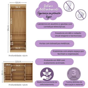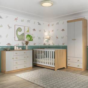 Diferenciais: - 3 anos de garantia contra defeitos de fabricação e material (exceto colchão). - Conjunto produzido em madeira de reflorestamento (MDP 12/15mm) com acabamento acetinado (cerca de 20% de brilho): sustentabilidade e durabilidade. - Berço 3 em 1 que se transforma em sofá e minicama, acompanhando o crescimento do bebê. - Lastro em madeira com 3 regulagens de altura e suporte para mosquiteiro para noites mais tranquilas e protegidas. - Berço certificado pelo INMETRO (Selo n 0000085/2018). - Padrão americano (tamanho do colchão: 130x70cm). - Colchão D18 incluso: possui tratamento antiácaro, antialérgico, antimofo e um dos lados impermeável. - Grade Soft (PVC): ecologicamente correta, com matéria-prima livre de metais pesados, atóxica e com proteção antiamarelamento. - Guarda-roupa com 2 portas e 2 gavetas: amplo espaço para organizar roupinhas e acessórios. - Cômoda com 2 portas e 4 gavetas. - Corrediças telescópicas: abertura total e silenciosa das gavetas. - Cabideiro em alumínio: permite acomodar roupas longas e curtas para que não amassem. - Puxadores em ABS delicados e práticos. - Rodapés: visual elegante para o guarda-roupa e a cômoda. - Sistema antitombamento no guarda-roupa e cômoda: proporciona segurança para o bebê e tranquilidade aos pais.