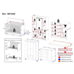Conteúdo da Embalagem: 1 (um) Berço 1 (um) Colchão 1 (um) Guarda-roupa 1 (uma) Cômoda Manual de Montagem Kit Ferragem