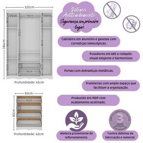 Diferenciais: - 3 anos de garantia contra defeitos de fabricação e material (exceto colchão). - Conjunto produzido em madeira de reflorestamento (MDP 12/15mm) com acabamento acetinado (cerca de 20% de brilho): sustentabilidade e durabilidade. - Berço 3 em 1 que se transforma em sofá e minicama, acompanhando o crescimento do bebê. - Lastro em madeira com 3 regulagens de altura e suporte para mosquiteiro para noites mais tranquilas e protegidas. - Berço certificado pelo INMETRO (Selo n 0000085/2018). - Padrão americano (tamanho do colchão: 130x70cm). - Colchão D18 incluso: possui tratamento antiácaro, antialérgico, antimofo e um dos lados impermeável. - Grade Soft (PVC): ecologicamente correta, com matéria-prima livre de metais pesados, atóxica e com proteção antiamarelamento. - Guarda-roupa com 4 portas e 2 gavetas: amplo espaço para organizar roupinhas e acessórios. - Cômoda com 4 gavetas. - Corrediças telescópicas: abertura total e silenciosa das gavetas. - Cabideiro em alumínio: permite acomodar roupas longas e curtas para que não amassem. - Puxadores em ABS delicados e práticos. - Rodapés usinados em MDF: visual elegante para o guarda-roupa e a cômoda. - Sistema antitombamento no guarda-roupa e cômoda: proporciona segurança para o bebê e tranquilidade aos pais.