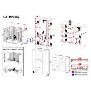 Dimensões do Produto Montado: Berço - Altura: 80,5cm | Largura: 133cm | Profundidade: 77,5cm Guarda-roupa - Altura: 189cm | Largura: 122cm | Profundidade: 41cm Cômoda - Altura: 88cm | Largura: 95cm | Profundidade: 42cm *Você pode consultar as medidas detalhadas na imagem técnica do produto.
