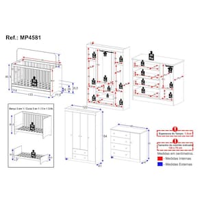 Dimensões do Produto Montado: Berço - Altura: 80,5cm | Largura: 133cm | Profundidade: 77,5cm Guarda-roupa - Altura: 184cm | Largura: 122cm | Profundidade: 41cm Cômoda - Altura: 83cm | Largura: 95cm | Profundidade: 42cm *Você pode consultar as medidas detalhadas na imagem técnica do produto.