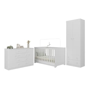Diferenciais: - 3 anos de garantia contra defeitos de fabricação e material. - Conjunto produzido em madeira de reflorestamento (MDP 12/15mm) com acabamento acetinado (cerca de 20% de brilho): sustentabilidade e durabilidade. - Berço 3 em 1 que se transforma em sofá e minicama, acompanhando o crescimento do bebê. - Lastro em madeira com 3 regulagens de altura e suporte para mosquiteiro para noites mais tranquilas e protegidas. - Berço certificado pelo INMETRO (Selo n 0000085/2018). - Padrão americano (tamanho do colchão indicado: 130x70cm). Colchão não incluso. - Grade Soft (PVC): ecologicamente correta, com matéria-prima livre de metais pesados, atóxica e com proteção antiamarelamento. - Guarda-roupa com 2 portas e 2 gavetas: amplo espaço para organizar roupinhas e acessórios. - Cômoda com 2 portas e 4 gavetas. - Corrediças telescópicas: abertura total e silenciosa das gavetas. - Cabideiro em alumínio: permite acomodar roupas longas e curtas para que não amassem. - Puxadores em ABS delicados e práticos. - Rodapés: visual elegante para o guarda-roupa e a cômoda. - Sistema antitombamento no guarda-roupa e cômoda: proporciona segurança para o bebê e tranquilidade aos pais.