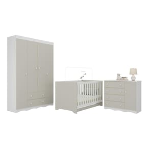 Diferenciais: - 3 anos de garantia contra defeitos de fabricação e material. - Conjunto produzido em madeira de reflorestamento (MDP 12/15mm) com acabamento acetinado (cerca de 20% de brilho): sustentabilidade e durabilidade. - Berço 3 em 1 que se transforma em sofá e minicama, acompanhando o crescimento do bebê. - Lastro em madeira com 3 regulagens de altura e suporte para mosquiteiro para noites mais tranquilas e protegidas. - Grade Soft (PVC): ecologicamente correta, com matéria-prima livre de metais pesados, atóxica e com proteção antiamarelamento. - Berço certificado pelo INMETRO (Selo n 0000085/2018). - Padrão americano (tamanho do colchão indicado: 130x70cm). Colchão não incluso. - Guarda-roupa com 4 portas e 2 gavetas: amplo espaço para organizar roupinhas e acessórios. - Cômoda com 1 porta e 4 gavetas. - Corrediças telescópicas: abertura total e silenciosa das gavetas. - Cabideiro em alumínio: permite acomodar roupas longas e curtas para que não amassem. - Puxadores em ABS delicados e práticos. - Rodapés usinados em MDF: visual elegante para o guarda-roupa e a cômoda. - Sistema antitombamento no guarda-roupa e cômoda: proporciona segurança para o bebê e tranquilidade aos pais.