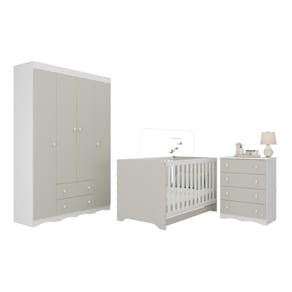 Diferenciais: - 3 anos de garantia contra defeitos de fabricação e material. - Conjunto produzido em madeira de reflorestamento (MDP 12/15mm) com acabamento acetinado (cerca de 20% de brilho): sustentabilidade e durabilidade. - Berço 3 em 1 que se transforma em sofá e minicama, acompanhando o crescimento do bebê. - Lastro em madeira com 3 regulagens de altura e suporte para mosquiteiro para noites mais tranquilas e protegidas. - Berço certificado pelo INMETRO (Selo n 0000085/2018). - Padrão americano (tamanho do colchão indicado: 130x70cm). Colchão não incluso. - Grade Soft (PVC): ecologicamente correta, com matéria-prima livre de metais pesados, atóxica e com proteção antiamarelamento. - Guarda-roupa com 4 portas e 2 gavetas: amplo espaço para organizar roupinhas e acessórios. - Cômoda com 4 gavetas. - Corrediças telescópicas: abertura total e silenciosa das gavetas. - Cabideiro em alumínio: permite acomodar roupas longas e curtas para que não amassem. - Puxadores em ABS delicados e práticos. - Rodapés usinados em MDF: visual elegante para o guarda-roupa e a cômoda. - Sistema antitombamento no guarda-roupa e cômoda: proporciona segurança para o bebê e tranquilidade aos pais.