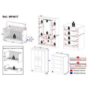 Dimensões do Produto Montado: Berço - Altura: 80,5cm | Largura: 133cm | Profundidade: 77,5cm Guarda-roupa - Altura: 184cm | Largura: 122cm | Profundidade: 41cm Cômoda - Altura: 83cm | Largura: 65cm | Profundidade: 42cm *Você pode consultar as medidas detalhadas na imagem técnica do produto.