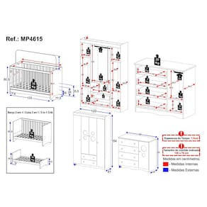 Dimensões do Produto Montado: Berço - Altura: 80,5cm | Largura: 133cm | Profundidade: 77,5cm Guarda-roupa - Altura: 184cm | Largura: 122cm | Profundidade: 41cm Cômoda - Altura: 83cm | Largura: 95cm | Profundidade: 42cm *Você pode consultar as medidas detalhadas na imagem técnica do produto.