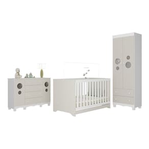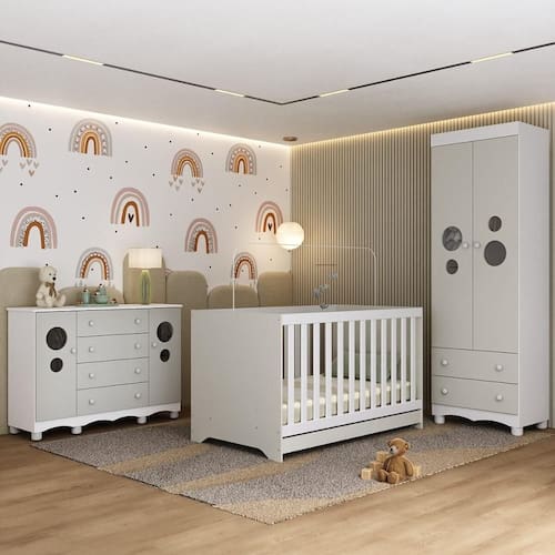 Diferenciais: - 3 anos de garantia contra defeitos de fabricação e material. - Conjunto produzido em madeira de reflorestamento (MDP 12/15mm) com acabamento acetinado (cerca de 20% de brilho): sustentabilidade e durabilidade. - Berço 3 em 1 que se transforma em sofá e minicama, acompanhando o crescimento do bebê. - Lastro em madeira com 3 regulagens de altura e suporte para mosquiteiro para noites mais tranquilas e protegidas. - Berço certificado pelo INMETRO (Selo n 0000085/2018). - Padrão americano (tamanho do colchão indicado: 130x70cm). Colchão não incluso. - Grade Soft (PVC): ecologicamente correta, com matéria-prima livre de metais pesados, atóxica e com proteção antiamarelamento. - Guarda-roupa com 2 portas e 2 gavetas: amplo espaço para organizar roupinhas e acessórios. - Cômoda com 2 portas e 4 gavetas. - Portas e gavetas produzidas em MDF. - Detalhes de vidro incolor temperado 3mm nas portas: toque charmoso que permite visualizar o interior dos móveis. - Corrediças telescópicas: abertura total e silenciosa das gavetas. - Cabideiro em alumínio: permite acomodar roupas longas e curtas para que não amassem. - Puxadores em ABS delicados e práticos. - Pés em polipropileno e rodapés usinados em MDF: visual elegante e estabilidade para o guarda-roupa e a cômoda. - Sistema antitombamento no guarda-roupa e cômoda: proporciona segurança para o bebê e tranquilidade aos pais.