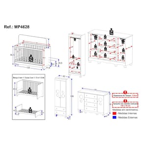 Dimensões do Produto Montado: Berço - Altura: 80,5cm | Largura: 133cm | Profundidade: 77,5cm Guarda-roupa - Altura: 189cm | Largura: 62cm | Profundidade: 41cm Cômoda - Altura: 88cm | Largura: 125cm | Profundidade: 42cm *Você pode consultar as medidas detalhadas na imagem técnica do produto.