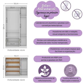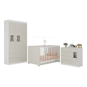 Diferenciais: - 3 anos de garantia contra defeitos de fabricação e material. - Conjunto produzido em madeira de reflorestamento (MDP 12/15mm) com acabamento acetinado (cerca de 20% de brilho): sustentabilidade e durabilidade. - Berço 3 em 1 que se transforma em sofá e minicama, acompanhando o crescimento do bebê. - Lastro em madeira com 3 regulagens de altura e suporte para mosquiteiro para noites mais tranquilas e protegidas. - Berço certificado pelo INMETRO (Selo n 0000085/2018). - Padrão americano (tamanho do colchão indicado: 130x70cm). Colchão não incluso. - Grade Soft (PVC): ecologicamente correta, com matéria-prima livre de metais pesados, atóxica e com proteção antiamarelamento. - Guarda-roupa com 3 portas e 2 gavetas: amplo espaço para organizar roupinhas e acessórios. - Cômoda com 1 porta e 4 gavetas. - Portas e gavetas produzidas em MDF. - Detalhes de vidro incolor temperado 3mm nas portas: toque charmoso que permite visualizar o interior dos móveis. - Corrediças telescópicas: abertura total e silenciosa das gavetas. - Cabideiro em alumínio: permite acomodar roupas longas e curtas para que não amassem. - Puxadores em ABS delicados e práticos. - Rodapés: visual elegante para o guarda-roupa e a cômoda. - Sistema antitombamento no guarda-roupa e cômoda: proporciona segurança para o bebê e tranquilidade aos pais.