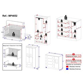 Dimensões do Produto Montado: Berço - Altura: 80,5cm | Largura: 133cm | Profundidade: 77,5cm Guarda-roupa - Altura: 184cm | Largura: 92cm | Profundidade: 41cm Cômoda - Altura: 83cm | Largura: 95cm | Profundidade: 42cm *Você pode consultar as medidas detalhadas na imagem técnica do produto.
