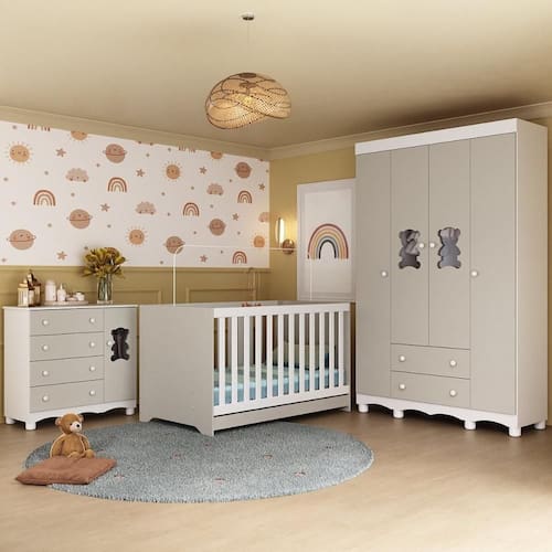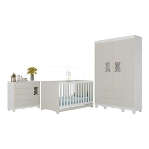 Diferenciais: - 3 anos de garantia contra defeitos de fabricação e material. - Conjunto produzido em madeira de reflorestamento (MDP 12/15mm) com acabamento acetinado (cerca de 20% de brilho): sustentabilidade e durabilidade. - Berço 3 em 1 que se transforma em sofá e minicama, acompanhando o crescimento do bebê. - Lastro em madeira com 3 regulagens de altura e suporte para mosquiteiro para noites mais tranquilas e protegidas. - Berço certificado pelo INMETRO (Selo n 0000085/2018). - Padrão americano (tamanho do colchão indicado: 130x70cm). Colchão não incluso. - Grade Soft (PVC): ecologicamente correta, com matéria-prima livre de metais pesados, atóxica e com proteção antiamarelamento. - Guarda-roupa com 4 portas e 2 gavetas: amplo espaço para organizar roupinhas e acessórios. - Cômoda com 1 porta e 4 gavetas. - Portas e gavetas produzidas em MDF. - Detalhes de vidro incolor temperado 3mm nas portas: toque charmoso que permite visualizar o interior dos móveis. - Corrediças telescópicas: abertura total e silenciosa das gavetas. - Cabideiro em alumínio: permite acomodar roupas longas e curtas para que não amassem. - Puxadores em ABS delicados e práticos. - Pés em polipropileno e rodapés usinados em MDF: visual elegante e estabilidade para o guarda-roupa e a cômoda. - Sistema antitombamento no guarda-roupa e cômoda: proporciona segurança para o bebê e tranquilidade aos pais.