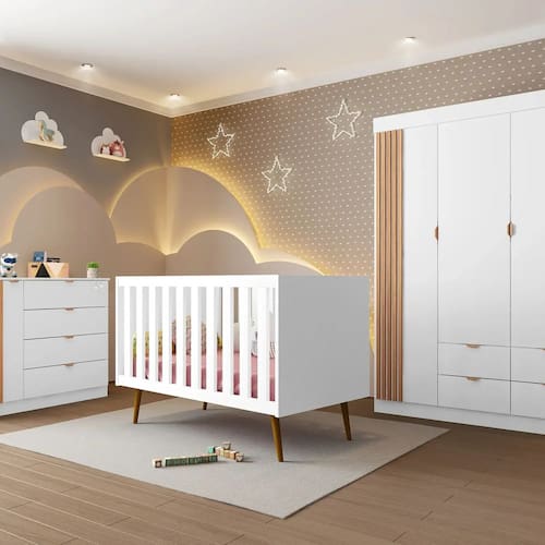 Com um design encantador, esses móveis são esteticamente agradáveis e extremamente funcionais. O Guarda Roupa possui 4 gavetas e 3 portas, já a Cômoda Infantil tem 4 gavetas e uma porta com prateleira interna. Os puxadores de alumínio na cor cobre adicionam um toque especial, com estrutura em 100% MDF, acabamento em pintura UV, corrediças telescópicas e dobradiças metálicas garante a durabilidade e realça a beleza. O guarda-roupa oferece um cabideiro de alumínio, quatro prateleiras e um maleiro, permitindo uma organização eficiente para roupas e acessórios das crianças. Acabamento da Gaveta: Pintura UV Acabamento da Porta: Pintura UV Acompanha Manual de Instalação: Sim Altura do Conjunto: 199 cm Ambiente Principal: Quarto Infantil Certificado: 006 495/2021 Certificado INMETRO (código): 006 495/2021 codigo_ean: 7900288172983 Complexidade da Montagem: Média: pode ser montado por mais de uma pessoa e/ou necessite de maior conhecimento para montagem Cor: Branco Cor do Produto: Branco Cor Interna: Branco Escala de Brilho: Acetinado Escala de Brilho da Gaveta: Fosco Estrado com Regulagem de Altura: Sim Estrado Regulável em Quantas Posições: 03 Largura do Conjunto: 381 cm Linha ou Coleção: Ayla Manual de Especificação Técnica: https://product-hub-prd.madeiramadeira.com.br/625790569/documents/25a34fe1-80d7-4771-9d8f-01d55d2391142950244187517480284933288.pdf Manual de Montagem e Instalação: https://product-hub-prd.madeiramadeira.com.br/625790569/documents/20d88888-cd63-485e-9837-53b5218ce0692996559532217498492278457.pdf Marca: Phoenix Baby Material da Gaveta: MDF Material da Porta: MDF Material da Prateleira: MDF Material do Estrado: HDF Material do Fundo: MDF Material do Puxador da Gaveta: Alumínio Material Principal: MDF Medida de Cada Item: Guarda Roupas: 199x136x45cm // Cômoda: 90x112x45cm // Berço 92x133x74cm modular: Não Necessita Montagem: Sim Origem do Produto: Nacional Peso: Guarda Roupas: 93kgs // Cômoda: 43Kgs // Berço : 36Kgs Peso de Cada Item: Guarda Roupas 93kgs, Comoda 43kgs, Berço 36kgs Porta Janelada: Não Possui Certificado: Sim Possui Espelhos: Não Possui Gavetas: Sim Possui Portas: Sim Possui Prateleiras: Sim Possui Rodízio: Não Profundidade do Conjunto: 74 cm Quantidade de Gavetas: 08 Quantidade de Prateleiras: 06 Recomendações de Uso, Manutenção e Limpeza: Pano Levemente umedecido Sistema de Montagem: Parafusos, cavilha, e Minifix Suporta Até (kg): 15.0000 Tipo de Corrediça da Gaveta: Metálica Telescópica Tipo de Dobradiça/Corrediça da Porta: Metálica Tipo de Puxador da Gaveta: Externo