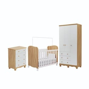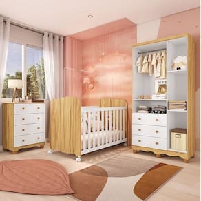 Desenvolvidos em 100% MDF e pintura UV atóxica os produtos oferecem muita segurança. O guarda-roupa e a cômoda possuem corrediças metálicas e acompanham 2 modelos de rodapés cada (1 reto e 1 torneado - usinado), para sua escolha. No guarda roupa o cabideiro também é metálico. O berço conta com muitos benefícios e qualidades, possui estrado móvel com 3 regulagens de altura, 4 rodízios sendo 2 com travas, grades fixa e claro, registro no INMETRO (001950/2019). O colchão indicado é de 70 x 130 (largura x comprimento). Tudo para que você e sua família tenham conforto e tranquilidade com a maior segurança. *Berço não possui montagem como mini cama*