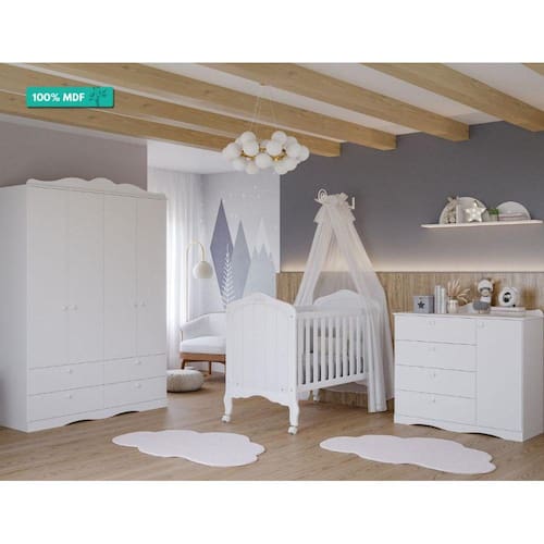 Quarto de Bebê Completo com Berço Mini Cama Harmonia, Cômoda 1 porta e Guarda roupa 4 Portas Encanto