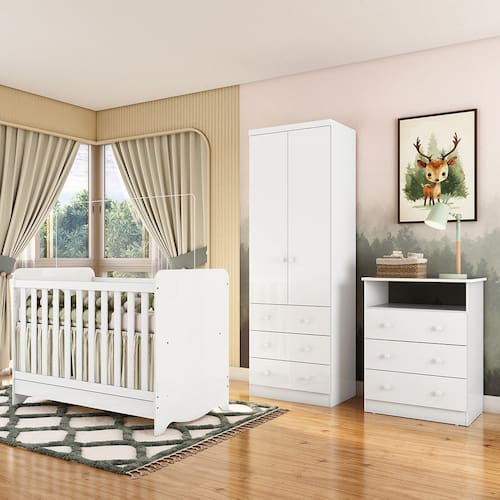 Quarto de Bebe Completo com Berco Minicama Ben e Guarda Roupa Comoda Smim New MDF Moveis Peroba - Branco