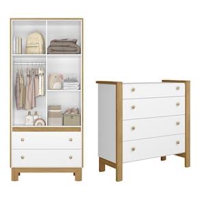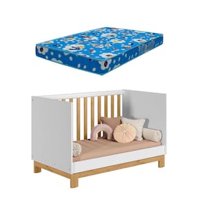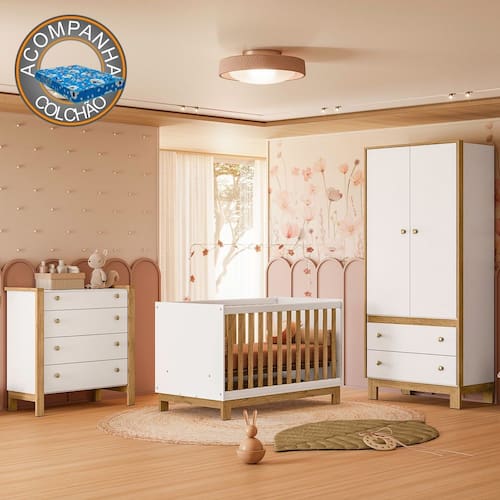 Quarto de Bebê Completo com Berço Slim Cômoda e Roupeiro Flora Branco Freijó Qmovi + Colchão Ortobom - Branco | Freijó