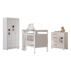 Berço minicama 100% MDF com grades envelopadas, sistema de fixação por buchas, 3 níveis de altura de estrado, equipado com rodízios. Acompanha Colchão D18. Kit para transformação em minicama e suporte mosquiteiro. Cômoda com 1 porta com detalhe em acrílico e 4 gavetas. Possui 1 prateleira. Dobradiças metálicas de pressão. Corrediças telescópicas. Acabamento acetinado. Roupeiro com 3 portas e 2 gavetas. Possui 1 cabideiro, 5 prateleiras. Dobradiças metálicas de pressão. Corrediças telescópicas. Produto com ótima divisão interna. Possui jogo de pés que permitem passagem de ventilação por baixo do móvel, facilitando a limpeza e evitando acúmulo de pó e pelos. Acabamento Ultravioleta atóxico acetinado. Acabamento da Gaveta: Pintura UV Acabamento da Porta: Pintura UV Acompanha Manual de Instalação: Sim Acompanha Suporte para Mosquiteiro: Sim - Sem Véu Ambiente Principal: Quarto de Bebê Certificado: OCAN-BER.278/19-3 codigo_ean: 7909903373361 Complexidade da Montagem: Alta: deve ser montado por um montador especializado Cor: Branco Cor do Produto: Branco Cor Interna: Branco Escala de Brilho: Fosco Escala de Brilho da Gaveta: Fosco Escala de Brilho da Porta: Fosco Escala de Brilho da Prateleira: Fosco Estampado: Não Estrado com Regulagem de Altura: Sim Estrado Regulável em Quantas Posições: 03 Linha ou Coleção: Mila Manual de Montagem e Instalação: https://product-hub-prd.madeiramadeira.com.br/861848/documents/f848b060-bbe2-4f8d-9ced-05adf6cfa0201434993conjuntomila.pdf Material da Gaveta: MDF Material da Porta: MDF Material da Prateleira: MDF Material do Estrado: MDF Material do Fundo: HDF Material do Puxador da Gaveta: MDF Material do Puxador da Porta: MDF Material Principal: MDF Medida de Cada Item: Berço; Altura: 111cm Largura: 149cm Profundidade: 80cm Cômoda; Altura: 96cm Largura: 94cm Profundidade: 39cm Roupeiro; Altura: 187cm Largura: 90cm Profundidade: 43cm Necessita Montagem: Sim Origem do Produto: Nacional Permite a Utilização de Cama Auxiliar: Não Peso: 97.0000 Peso de Cada Item: 23,8kg / 33kg / 51kg / 1,37kg Pintura Atóxica: Sim Possui Certificado: Sim Possui Gavetas: Sim Possui Grade: Sim Possui Portas: Sim Possui Prateleiras: Sim Possui Rodízio: Sim Possui Trocador: Não Quantidade de Gavetas: 06 Quantidade de Portas: 04 Quantidade de Prateleiras: 03 Recomendações de Uso, Manutenção e Limpeza: Limpar com pano macio e levemente umedecido. Não utilizar solventes a base e de inflamáveis. Não utilizar produtos abrasivos. Sistema de Montagem: Parafusos e Cavilhas. Suporta Até (kg): 160.0000 Tipo de Corrediça da Gaveta: Metálica Telescópica Tipo de Dobradiça/Corrediça da Porta: Metálica Tipo de Grade: Fixa Tipo de Guarda-Roupa: Infantil Tipo de Porta: Bater Tipo de Puxador da Gaveta: Externo Tipo de Puxador da Porta: Externo