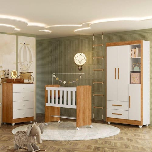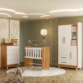 Miniberço para uso, principalmente durante o resguardo, para bebês que ainda não sentam, ajoelha e levantam sozinhas, pode ser levado de um ambiente ao outro sem a necessidade de desmontar. Fabricado em 100% MDF com sistema de fixação por buchas internacionais, acompanha kits rodízios. Acabamento acetinado. Colchão D18 incluso. Cômoda com 4 gavetas. Possui corrediças metálicas telescópicas. Acabamento acetinado. Fornecido com o jogo de pés que permitem passagem de ventilação por baixo do móvel, facilitando a limpeza e evitando acúmulo de pó e pelos. Roupeiro com 3 portas e 2 gavetas. Possui 1 cabideiro, 5 prateleiras. Dobradiças metálicas de pressão. Corrediças telescópicas. Produto com ótima divisão interna. Possui jogo de pés que permitem passagem de ventilação por baixo do móvel. Acabamento da Gaveta: Pintura UV Acabamento da Porta: Pintura UV Acompanha Manual de Instalação: Sim Acompanha Suporte para Mosquiteiro: Sim - Sem Véu Ambiente Principal: Quarto de Bebê Certificado: BER-619/2017-6 codigo_ean: 7909903373446 Complexidade da Montagem: Alta: deve ser montado por um montador especializado Cor: Amadeirado/Branco Cor do Produto: Amadeirado/Branco Cor Interna: Branco Escala de Brilho: Fosco Escala de Brilho da Gaveta: Fosco Escala de Brilho da Porta: Fosco Escala de Brilho da Prateleira: Fosco Estampado: Não Estrado com Regulagem de Altura: Não Estrado Regulável em Quantas Posições: 03 Linha ou Coleção: Lila Manual de Montagem e Instalação: https://product-hub-prd.madeiramadeira.com.br/861894/documents/8b619ad9-ed06-4986-8798-12728767c3ac1435337conjuntolila.pdf Material da Gaveta: MDF Material da Porta: MDF Material da Prateleira: MDF Material do Estrado: MDF Material do Fundo: HDF Material do Puxador da Gaveta: MDF Material do Puxador da Porta: MDF Material Principal: MDF Medida de Cada Item: Berço; Altura: 88,5cm Largura: 94cm Profundidade: 45cm Cômoda; Altura: 96cm Largura: 64cm Profundidade: 39cm Roupeiro; Altura: 187cm Largura: 90cm Profundidade: 40cm Necessita Montagem: Sim Origem do Produto: Nacional Permite a Utilização de Cama Auxiliar: Não Peso: 98.0000 Peso de Cada Item: 17kg / 23kg / 0,7kg / 58kg Pintura Atóxica: Sim Possui Certificado: Sim Possui Gavetas: Sim Possui Grade: Sim Possui Portas: Sim Possui Prateleiras: Sim Possui Rodízio: Sim Possui Trocador: Não Quantidade de Gavetas: 06 Quantidade de Portas: 03 Quantidade de Prateleiras: 05 Recomendações de Uso, Manutenção e Limpeza: Limpar com pano macio e levemente umedecido. Não utilizar solventes a base e de inflamáveis. Não utilizar produtos abrasivos. Sistema de Montagem: Parafusos e Cavilhas. Suporta Até (kg): 140.0000 Tipo de Corrediça da Gaveta: Metálica Telescópica Tipo de Dobradiça/Corrediça da Porta: Metálica Tipo de Grade: Fixa Tipo de Guarda-Roupa: Infantil Tipo de Porta: Bater Tipo de Puxador da Gaveta: Externo Tipo de Puxador da Porta: Externo