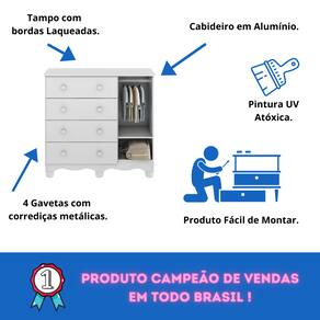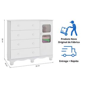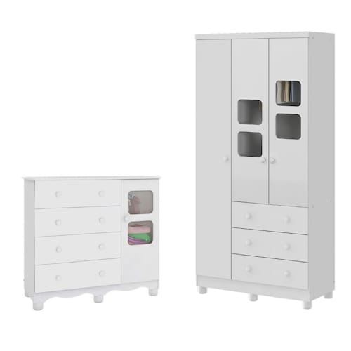 Quarto de Bebe Completo com Guarda Roupa 3 Portas 1 Cômoda Uli 4 Gavetas Móveis Peroba são móveis que se complementam, facilitando muito a vida de quem está montando um quarto do bebe, buscando melhor organização e decoração para o ambiente.O quarto de bebe completo Peroba é composto pelo Armário Uli 03 portas com a Cômoda Uli.Produtos 100% MDF, pintura é atôxica, possuem cabideiro metálico, puxadores plásticos, corrediças metálicas, pés em ABS e ainda 02 modelos de rodapé inclusos.As portas tem acabamento com PETG cristal. FICHA TÉCNICA-Côrmoda Infantil UliAltura: 88 cmLargura: 95,3 cmProfundidade: 42 cmQuantidade de Gavetas: 04 Gavetas ( Peso suportado 4Kg)Quantidade de Portas: 01 PortaMaterial: 100% MDFCores Disponíveis: Branco Brilho / Branco Brilho com CarvalhoAcabamento do Produto: Pintura UV Atóxica/ Pintura PU e Fita de BordoAcabamento das Portas: PETG Cristal ( Acrílico transparente )Tipo de Corrediça: Corrediça MetálicaTipo de Cabideiro: Cabideiro MetálicoTipo de Puxadores: PlásticosTipo de Pés: Plásticos ( Altura 6cm)Rodapé: 1 Reto e 1 Ondulado (Cliente escolhe na montagem)-Guarda Roupa Infantil UliAltura: 188 cmLargura: 92 cmProfundidade: 41 cmQuantidade de Gavetas: 03 Gavetas ( Peso suportado 4Kg)Quantidade de Portas: 03 PortasMaterial: 100% MDFCores Disponíveis: Branco Brilho / Branco Brilho com CarvalhoAcabamento do Produto: Pintura UV Atóxica/ Pintura PU e Fita de BordoAcabamento das Portas: PETG Cristal ( Acrílico transparente )Tipo de Corrediça: Corrediça MetálicaTipo de Cabideiro: Cabideiro MetálicoTipo de Puxadores: PlásticosTipo de Pés: Plásticos ( Altura 6cm)Rodapé: 1 Reto e 1 Ondulado (Cliente escolhe na montagem)Embalagem: Peças envoltas em isomanta, caixa de papelão revestidas com plástico termoencolhívelManual de Montagem: Manual segue na embalagem do produtoRecomendações de Uso, Manutenção e Limpeza:Para limpeza utilize somente pano limpo e macio, ligeiramente umedecido em água (apenas o bastante para remover a poeira), seguido de um pano seco. Perguntas Frequentes:A - É fácil montar Guarda Roupa Infantil e Cômoda Infantil Uli da Móveis Peroba?Sim, é fácil. Ao abrir a embalagem pode parecer complicado, mas é só seguiro passo a passo no manual de montagem que você consegue!B - Qual Berço combina com o Guarda Roupa Infantil e Cômoda Infantil Uli da Móveis Peroba?Para ter mais beleza, estilo e praticidade no quarto do seu bebê, sugerimos completar sua coleção como Berço Uli. É só pesquisar aqui no site que você vai encontrar.C - Tenho a opção de comprar Guarda Roupa Infantil ou Cômoda Infantil Uli separado?Sim, só buscar aqui no site que vai encontrar nossa oferta.D - Qual a configuração do Guarda Roupa Infantil e Cômoda Infantil Uli da Móveis Peroba?É uma Cômoda infantil Uli com 4 gavetas e 1 porta.Guarda Roupa Infantil Uli com 3 gavetas e 3 portas.E - Quais as cores disponíveis para o Guarda Roupa Infantil e Cômoda Infantil Uli da Móveis Peroba?Temos nas cores Branco Brilho / Branco Brilho com Carvalho. F - Onde comprar o Guarda Roupa Infantil e Cômoda infantil Uli com segurança?Aqui é o site com o melhor preço e condições de entrega para você comprar.G - Onde são fabricados o Guarda Roupa Infantil e Cômoda Infantil Uli?Guarda Roupa Infantil e Cômoda Infantil Uli sâo fabricados na cidade de Linhares-ES, pela Peroba Móveis Infantis.A Peroba é atualmente uma das maiores fábricas de Móveis Infantis da América Latina.