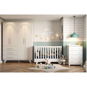 Inspirado no estilo retrô do passado com um toque de modernidade a linha Retrô da Móveis Peroba é encantadora. O berço é certificado pelo INMETRO no registro 000781/2018, tem a opção de ser utilizado como mini cama, acompanha um suporte para mosquiteiro e a base do colchão é regulável em 3 opções de altura, aumentando o conforto no uso diário e na segurança com o crescimento do seu pequeno(a). São móveis com acabamento em pintura UV atóxica e com a qualidade de ser produzido em 100% MDF. As gavetas do guarda roupas possuem corrediças telescópicas e suportam até 4kg cada. Tudo para oferecer um quartinho aconchegante, pratico e lindo para o seu bebê. Acompanha Colchão: Não Altura do Conjunto: 209,6 cm Ambiente Principal: Quarto de Bebê codigo_ean: 7909903169643 Complexidade da Montagem: Alta: deve ser montado por um montador especializado Cor: Branco Cor do Produto: Branco Estrado com Regulagem de Altura: Sim Informação Complementar: 1x Cômoda Infantil 4 Gavetas 100% MDF Júnior Branco Brilho Largura: 65.09999999999999 Altura: 88 Peso: 23.32 Profundidade: 42 Necessita Montagem: Sim