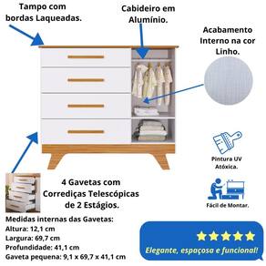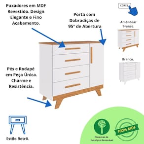 Tem 4 gavetas profundas que deslizam suavemente com Corrediças Telescópicas, durabilidade e segurança ao abrir e fechar. Possui o tampo com Bordas Laqueadas proporcionando um acabamento lindo e um cuidado extra para você e seu bebê. Conta ainda com 1 porta Lisa, cabideiro metálico e 1 prateleira.