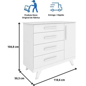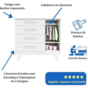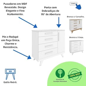 O Quarto de bebê Completo Retrô composto por Guarda Roupa e Cômoda é um conjunto clássico e versátil, ideal para todos os tipos de crianças. Com compartimentos para garantir que itens e peças básicas para o seu cotidiano estejam sempre à mão, facilitando assim a organização e decorando o ambiente com o estilo Retrô. A linda Cômoda Retrô 1 Porta Lisa da Móveis Peroba foi desenhada no estilo Retrô deixando o quarto do seu bebê ainda mais elegante. Feita com material 100% MDF, com diversas utilidades, podendo ser usada como trocador e com muito espaço para manter o ambiente organizado.Tem 4 gavetas profundas que deslizam suavemente com Corrediças Telescópicas, durabilidade e segurança ao abrir e fechar. Possui o tampo com Bordas Laqueadas proporcionando um acabamento lindo e um cuidado extra para você e seu bebê. Conta ainda com 1 porta Lisa, cabideiro metálico e 1 prateleira.O Guarda Roupa Retrô 04 portas lisa é um produto 100% MDF, sua pintura é atoxica, possui cabideiros metálicos, puxadores em MDF revestido, divisórias de gavetas (vendidas separadamente) e corrediças telescópicas.FICHA TÉCNICA-Cômoda Infantil RetrôAltura: 104,8 cmLargura: 118,6 cmProfundidade: 50,3 cmQuantidade de Gavetas: 04 Gavetas ( Peso suportado 4Kg)Quantidade de Portas: 01 PortaMaterial: 100% MDFCores Disponíveis: Branco Brilho / Branco Brilho com Carvalho / Branco Brilho com CinzaAcabamento do Produto: Pintura UV Atóxica/ Pintura PU e Fita de BordoAcabamento das Portas: Lisa Pintura UV AtóxicaTipo de Corrediça: Corrediça TelescópicaTipo de Cabideiro: Cabideiro MetálicoTipo de Puxadores: MDF revestidoTipo de Pés: MDFRodapé: Desenho RetrôEmbalagem: Peças envoltas em isomanta, caixa de papelão revestidas com plástico termoencolhível.Manual de Montagem: Manual segue na embalagem do produto -Guarda Roupa Infantil RetrôAltura: 209,6 cmLargura: 154,8 cmProfundidade: 49,8 cmQuantidade de Gavetas: 03 Gavetas ( Peso suportado 4Kg)Quantidade de Portas: 04 PortasMaterial: 100% MDFCores Disponíveis: Branco Brilho / Branco Brilho com Carvalho / Branco Brilho com CinzaAcabamento do Produto: Pintura UV Atóxica/ Pintura PU e Fita de BordoAcabamento das Portas: Lisa Pintura UV AtóxicaTipo de Corrediça: Corrediça TelescópicaTipo de Cabideiro: Cabideiro MetálicoTipo de Puxadores: MDF revestidoTipo de Pés: MDFRodapé: Desenho RetrôEmbalagem: Peças envoltas em isomanta, caixa de papelão revestidas com plástico termoencolhívelManual de Montagem: Manual segue na embalagem do produtoGuarda-Roupa Suporta Até (kg) : 60 kgRecomendações de Uso, Manutenção e Limpeza:Para limpeza utilize somente pano limpo e macio, ligeiramente umedecido em água (apenas o bastante para remover a poeira), seguido de um pano seco. Perguntas Frequentes:A - É fácil montar o Guarda Roupa Infantil e Cômoda Infantil Retrô da Móveis Peroba?Sim, é fácil. Ao abrir a embalagem pode parecer complicado, mas é só seguiro passo a passo no manual de montagem que você consegue!B - Tenho a opção de comprar Guarda Roupa Infantil ou Cômoda Infantil Retrô separado?Sim, só buscar aqui no site que vai encontrar nossa oferta.C - Qual a configuração do Guarda Roupa Infantil e Cômoda Infantil Retrô da Móveis Peroba?É uma Cômoda infantil Retrô com 4 gavetas e 1 porta.Guarda Roupa Infantil Retrô com 3 gavetas e 4 portas.D - Como organizar a Cômoda infantil Retrô?Você vai naturalmente encontrar a melhor maneira de organizar sua cômoda.Entretanto, vale a pena pontuar algumas situações:1-A cômoda deve estar sempre limpa*;2-O Trocador (caso você tenha) pode ocupar bastante espaço no tampo da cômoda;3-Primeira Gaveta: Utilize para os produtos de Higiene do bebê;4-Demais Gavetas: Utilize para roupas e acessórios do bebê.E - Quais as cores disponíveis para o Guarda Roupa Infantil e Cômoda Infantil Retrô da Móveis Peroba?Temos nas cores Branco Brilho / Branco Brilho com Carvalho / Branco Brilho com Cinza F - Onde comprar o Guarda Roupa Infantil e Cômoda infantil Retro com segurança?Aqui é o site com o melhor preço e condições de entrega para você comprar.G - Onde são fabricados o Guarda Roupa Infantil e Cômoda Infantil Retrô?O Guarda Roupa Infantil e Cômoda Infantil Retrô são fabricados na cidade de Linhares-ES, pela Peroba Móveis Infantis.A Peroba é atualmente uma das maiores fábricas de Móveis Infantis da América Latina.