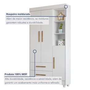 Este quarto de bebê completo é ideal para quem busca praticidade e um ambiente acolhedor. O berço oferece conforto e segurança para o bebê, e pode ser ajustado conforme ele cresce. A cômoda possui gavetas marcantes para organizar as roupas e acessórios do bebê, mantendo tudo sempre em ordem. A guarda-roupa tem excelente capacidade de armazenamento, com divisões internas e prateleiras. Com um design encantador, esse conjunto cria um espaço seguro, organizado e cheio de estilo para o bebê. O berço pode ser ajustado conforme o bebê cresce? Não. O guarda-roupa tem divisórias? Sim, o guarda-roupa possui prateleiras e divisões internas para otimizar o espaço.
